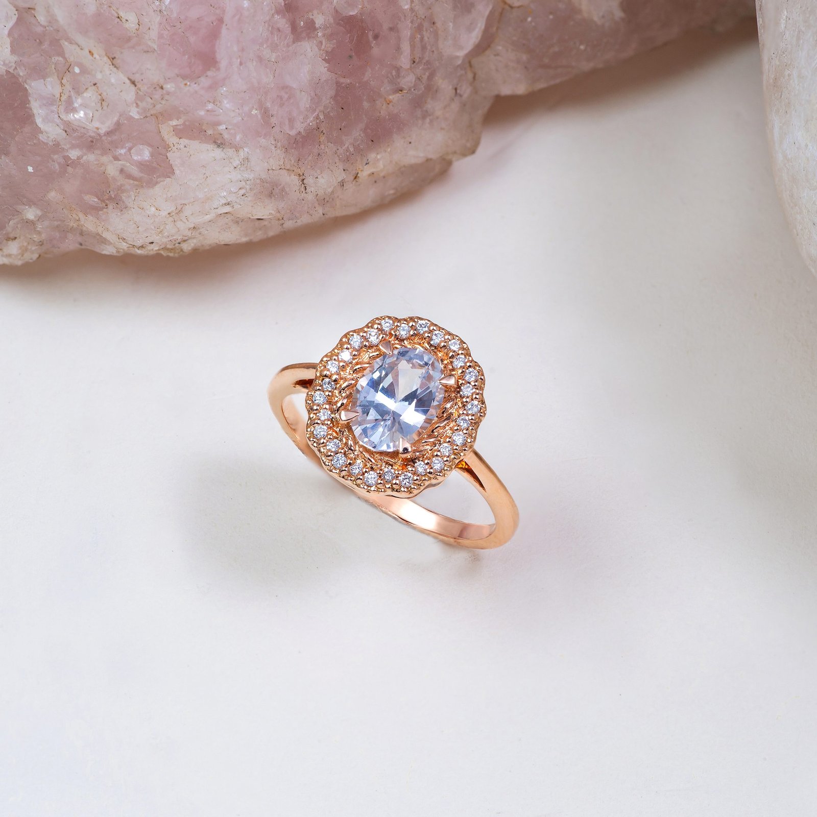 The Desirée Ring, an exquisite piece from our Rose Gold Collection, exudes a timeless charm with its elegant design and refined details. Crafted in luxurious 18KT rose gold, this ring features a brilliant white sapphire weighing 1.35 carats as its centrepiece. The sapphire’s pristine beauty creates a striking focal point, symbolizing grace and sophistication.